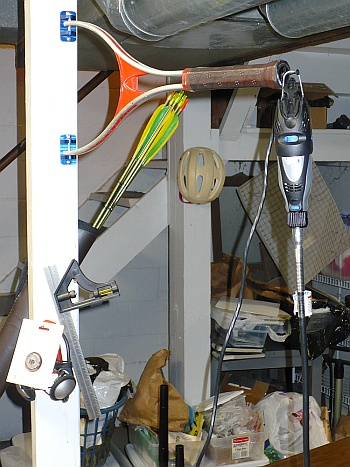 up table space.So instead, I chopped up a tennis racket, mounted it to two brackets and mounted that to a conveniently located wood support column. When not using this, I can simply swing it to the side of the table. (Also, I run the power cord through the tennis racket, so that's not in the way now.) Nice and simple.