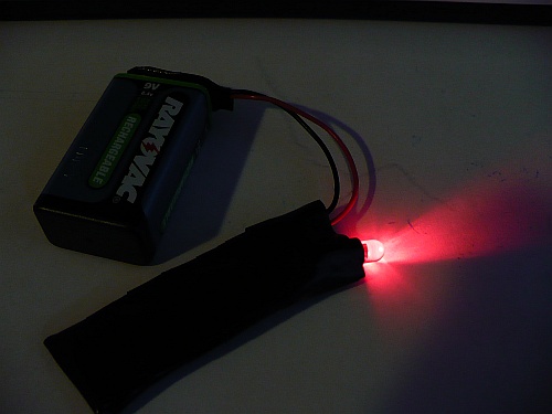 be very elusive, I figured I could build my own.This light comprises an old red LED from my dad's small collection of neat electronics, a 120 ohm resistor that I salvaged from an old radio, an old 9V battery snap, and a rechargeable NiMH 9V batteries. I initially tried several other resistors of higher resistance – calculations said I needed around 250 ohms – but that didn't give me a particularly bright LED. Once I had the wiring and soldering done (I had to solder directly to the resistor as one of it's leads was so short), I wrapped the wiring and a back-board of plastic in black electrical tape to hide my sloppy electrical work...