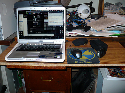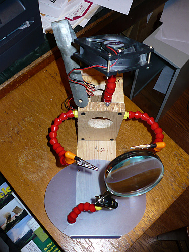 dremel, and a third hand for holding wires and such as I solder them.I got the idea for the alternative third hand from Instructables.com. I subsequently had my brother get me the necessary coolant hose pieces from Enco.com as a last minute Christmas gift. Said coolant hose is normally used on metal-machining setups such as lathes, saws and mills. The magnifying glass proved to not be useful for the work I do. The computer case fan draws the soldering fumes away from me a bit. If I were serious about avoiding the fumes, I'd put an air filter on there too.