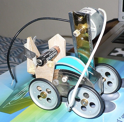 the 9V battery (apparently missing from the above picture).Ultimately, it's a very simple creation, but it's fun to hook up and watch it roll when I need a break from more serious things. The gearing ratio makes it good at climbing and then tipping itself. It's got lots of sentimental value since it's one of my first 'hacks.'